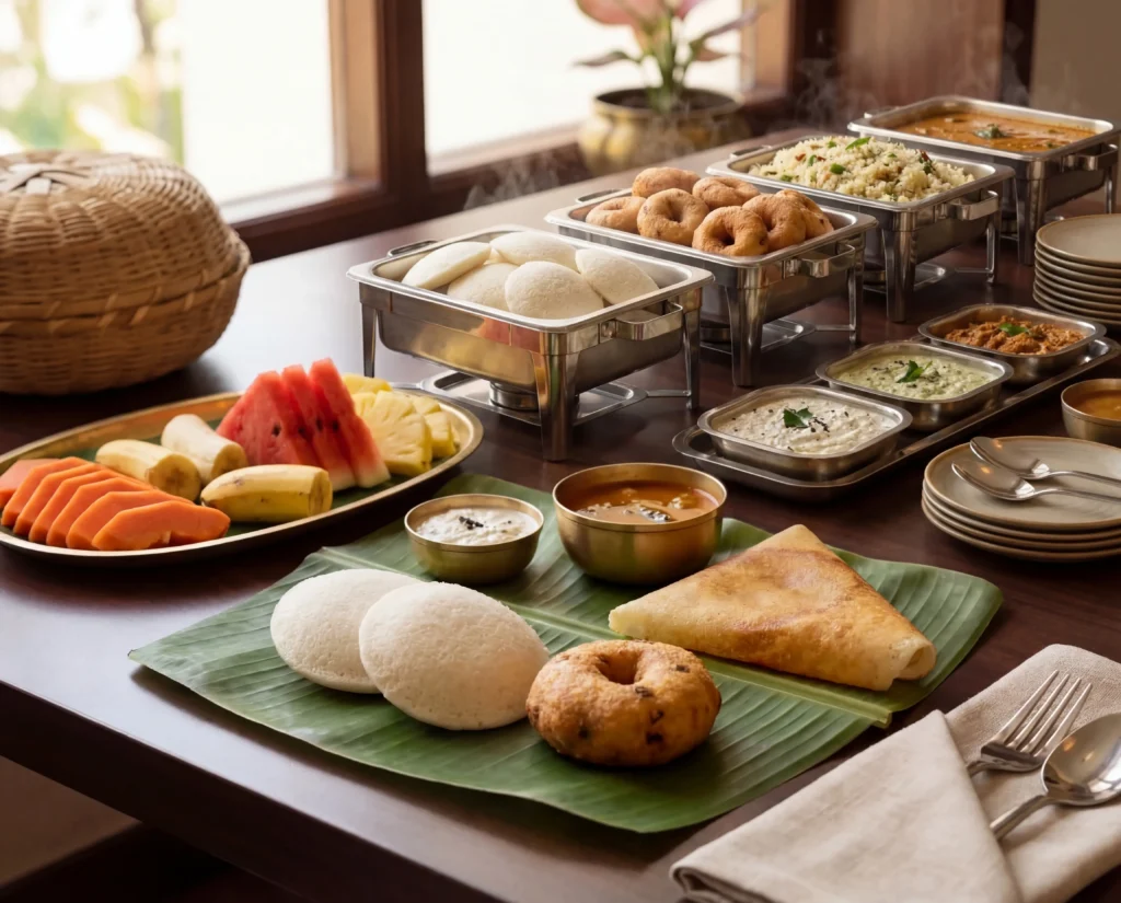 Begin your day at Aura Inn & Suites with a delightful buffet breakfast experience. Our breakfast selection features freshly prepared favourites such as idli, dosa, vada, and other traditional South Indian dishes, served with flavourful chutneys and sambar. Guests can enjoy a variety of dishes arranged in a convenient buffet spread, allowing you to choose from freshly prepared items and seasonal accompaniments. Prepared using quality ingredients and traditional recipes, our breakfast ensures a warm and satisfying start to your day before you head out to explore the city of Mysuru.